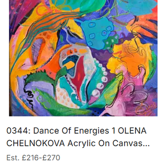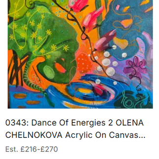 Olena’s abstract pieces are a thrilling contrast to her figurative scenes.Her Dance of Energies series (Lots 0343, 0344, 0346) pulses with colour and movement—fluid shapes, botanical suggestions, rhythmic brushstrokes, and vibrant chromatic contrasts. These works bubble with joy, spontaneity, and emotional richness, perfectly embodying her instinctive approach to abstract art.