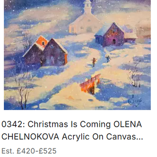 One of the most enchanting works in the auction, Christmas Is Coming, captures the gentle stillness of winter. In this peaceful snow-covered village, warm light pours from cottage windows and a distant church spire glows against the soft blue evening sky. It is atmospheric, nostalgic, and full of quiet magic—the kind of painting that reminds us of the wonder of the festive season.